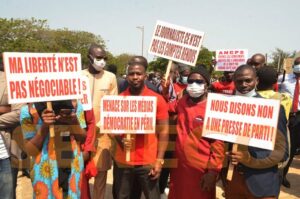 Les journalistes, soutenus par des défenseurs des droits de l’homme et des personnalités de la société civile se sont massivement mobilisés devant les locaux du ministère de la communication ce 3 mai, journée mondiale de la liberté de la presse, pour dénoncer les maux qui gangrènent leur secteur. Ils ont brandi des pancartes sur lesquelles on pouvait lire « Nous voulons des salaires décents », « Menaces sur les médias, démocratie en péril”, ou encore « Pour une loi d’accès à l’information », en autre autre revendications. Et sur les t-shirts, sont imprimés « Presse en danger » et « Doyna, ça suffit »