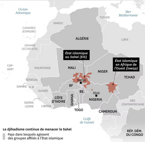 Dans le Sahel, le Groupe de soutien à l’islam et aux musulmans (acronyme arabe Jnim, affilié à Al-Qaida) et l’État islamique au Grand Sahara (EIGS, affilié à l’État islamique) multiplient les attaques et menacent d’effondrement certains États, comme le Mali ou encore le Burkina Faso, qui ploient sous la pression sécuritaire.