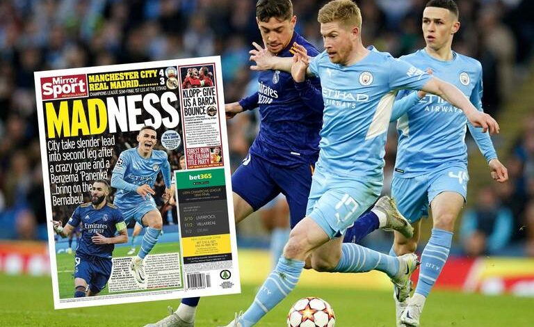 « Madrid s’en sort vivant », titre de son côté le quotidien Sport, Le City de Guardiola a mis les Blancos en difficulté après une démonstration de jeu, mais Benzema et Vinicius sont venus à la rescousse pour laisser la porte de la finale grande ouverte. » Alors que As pointe le fait que le Real Madrid devra être meilleur défensivement lors de la rencontre retour pour espérer remporter la Ligue des Champions : « Il y aura du travail au Bernabeu », peut-on lire en une, « Madrid a ressuscité à trois reprises et compte sur le chaudron du stade au match retour. »