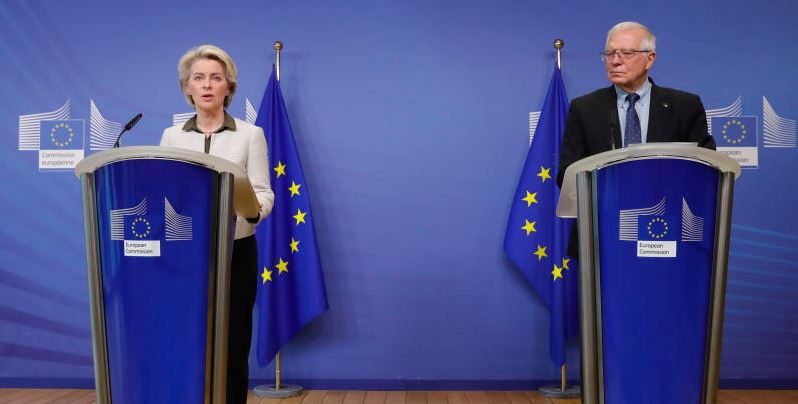 La présidente de la Commission européenne, Ursula von der Leyen, et le chef de la diplomatie européenne, Josep Borrell, annoncent que l’Union européenne financera l’achat et la livraison d’armes et d’autres équipements à l’Ukraine, le 27 février 2022, à Bruxelles.