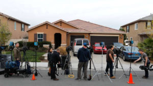 Members of the news media stand outside the home of the Turpins in Perris