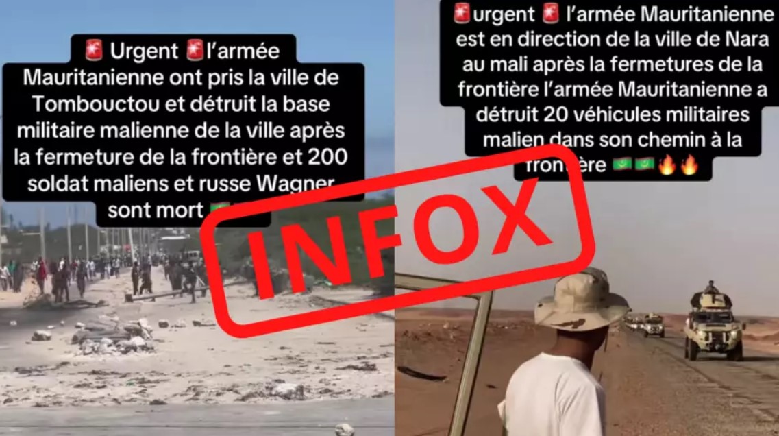 Cette infox s’inscrit dans une véritable opération de désinformation. Nous avons en effet identifié toute une série de contenus diffusant ce même narratif mensonger. Une autre vidéo prétend par exemple montrer des véhicules blindés de l’armée mauritanienne en direction de la ville de Nara, au Mali.