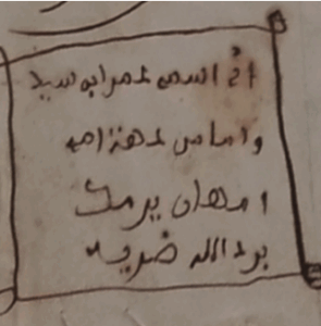 À sa disparition, il n’avait laissé ni femme ni enfant29 ; et selon El Hadj Abou Kébé, un des intervenants, ce marabout n’aurait eu qu’un demi- frère appelé Samba Seydi30, dont lui-même était un des petits-fils. Cette même source ajoute qu’Oumar Seydi avait été capturé par des Maures qui l’auraient vendu à un Burba (roi) du Djolof qui, à son tour, le revendit à des négriers en Gambie. Le prénom de la mère de ce marabout, tel que le donne la tradition orale, constitue un important élément d’identification d’Omar ibn Said, car en parfaite concordance avec ce que l’auteur de The Life écrivait lui-même. Omar ibn Said, qui était rassuré qu’il ne retournerait plus en Afrique, avait pris l’habitude de s’identifier par la mention qui suit : « Moi, je m’appelle Omar ibn Said ; du côté de ma mère c’est Umhani Yaznik ; que Dieu rafraîchisse sa tombe.31 » Trad. A. Gnokane Umhan Yaznik, écrit aussi en Umhan Yasnik dans les anciennes sources américaines et qui apparaît dans de récentes transcriptions en Umm Hani Y.R.M.K (Hunwick 2003-2004 : 62) et en Umm Hani Yarmake (Shareef 2011 : 29), n’est autre que la corruption du nom Umuhani Yéro Makka de la tradition villageoise. Le prénom est nettement lisible dans un manuscrit daté de 1855, rédigé en faveur du missionnaire John Frederick Foard, tel que le montre clairement le document ci-dessous, reproduit par Allan D. Austin (1984 : 476).